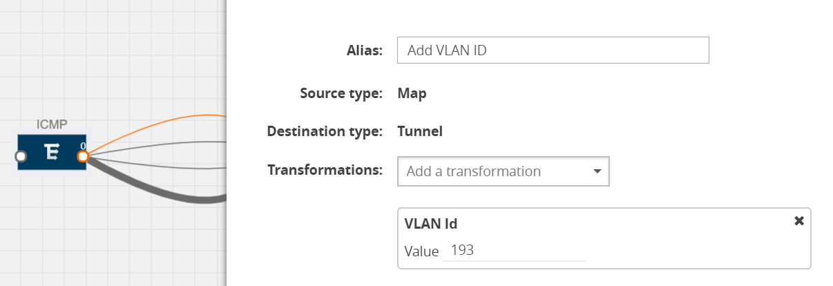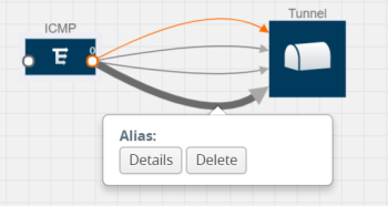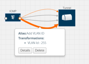 In Figure 1: Action Set with Multiple Links, the filtered packets from the ICMP map are sent to the same tunnel endpoint in four different links. In each link, you can apply one or more header transformations. A link with the header transformation applied is displayed in orange. When you mouse over the orange link, a detailed information about the alias and the type of transformation is displayed.