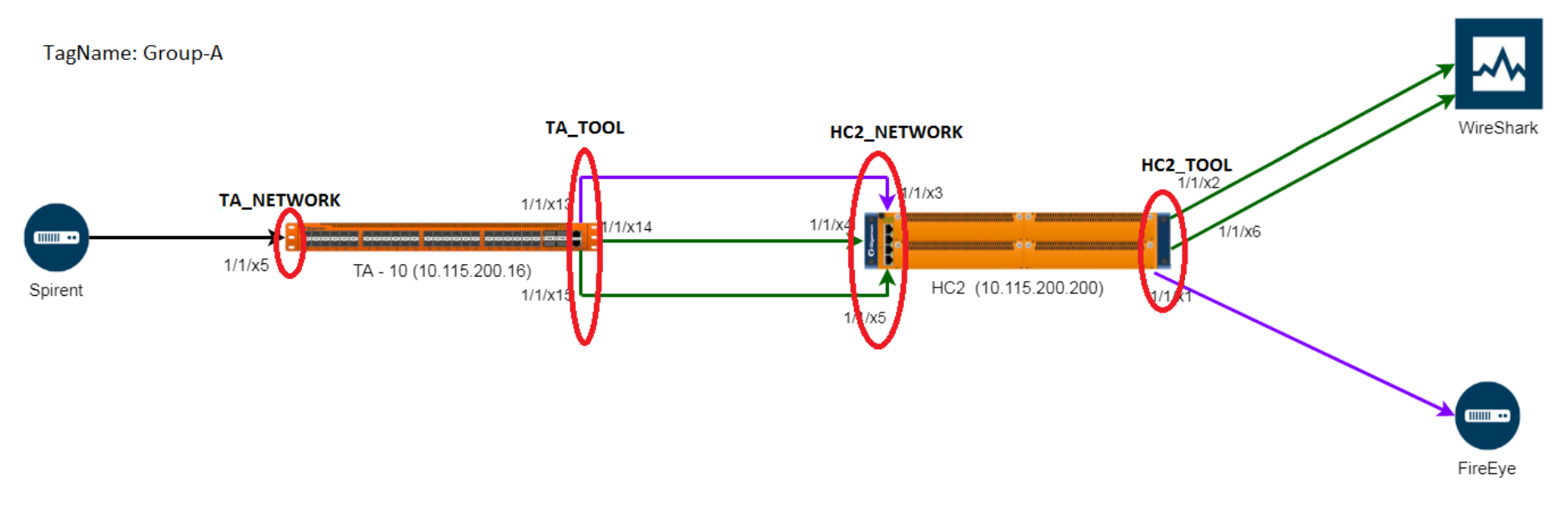 Aggregation tags are used to aggregate the resources for the purpose of collecting and analyzing statistics. For example, using aggregation tags, you can easily view and compare the aggregated traffic flowing through a list of ports. To analyze the aggregated traffic flowing through the ports highlighted in red in the following figure, you can create a tag ID with the name Group-A and assign the tag values as shown in the table.