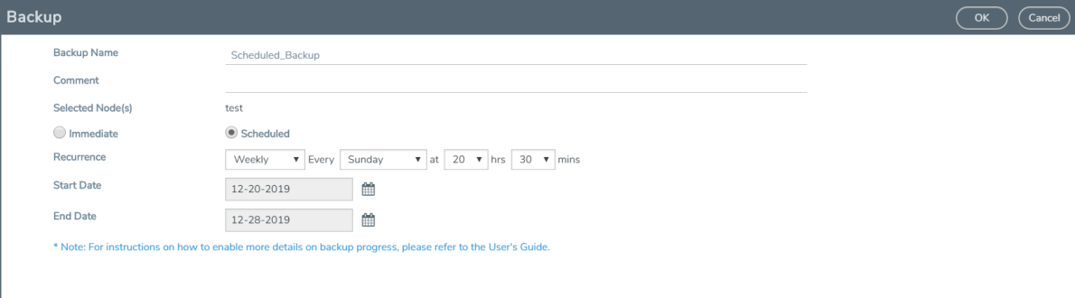 Figure 1 shows an example of nodes with scheduled backups. In this example, the weekly backups start on December 20 and occurs every Saturday at 8:30 pm until December 28.