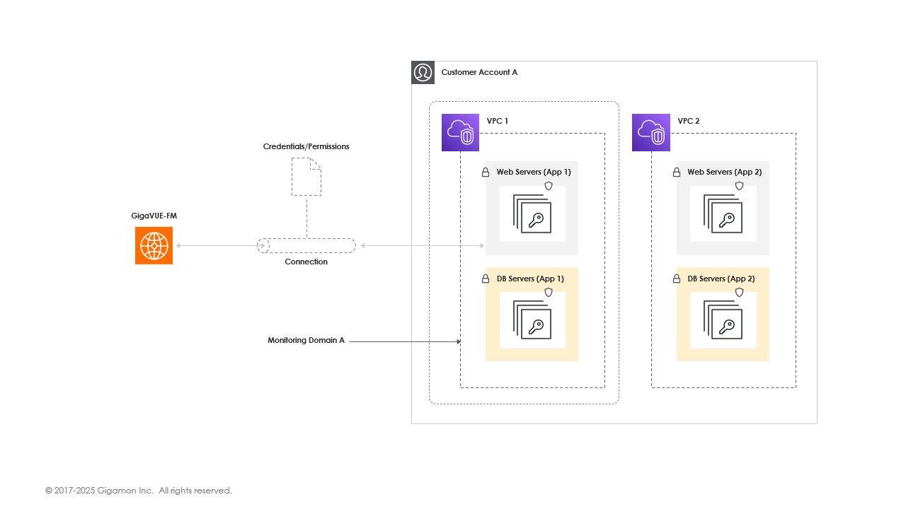 The Monitoring Domain defines a clear boundary within which GigaVUE-FM operates. This ensures both security and performance goals are achieved. In this case, you do not want GigaVUE-FM to access any VPCs other than VPC 1, GigaVUE-FM complies with your intent by restricting its operations strictly to the boundary defined by the Monitoring Domain. Additionally, the actions of GigaVUE-FM are further restricted by the credentials and permissions you provide through the connection associated with the Monitoring Domain.