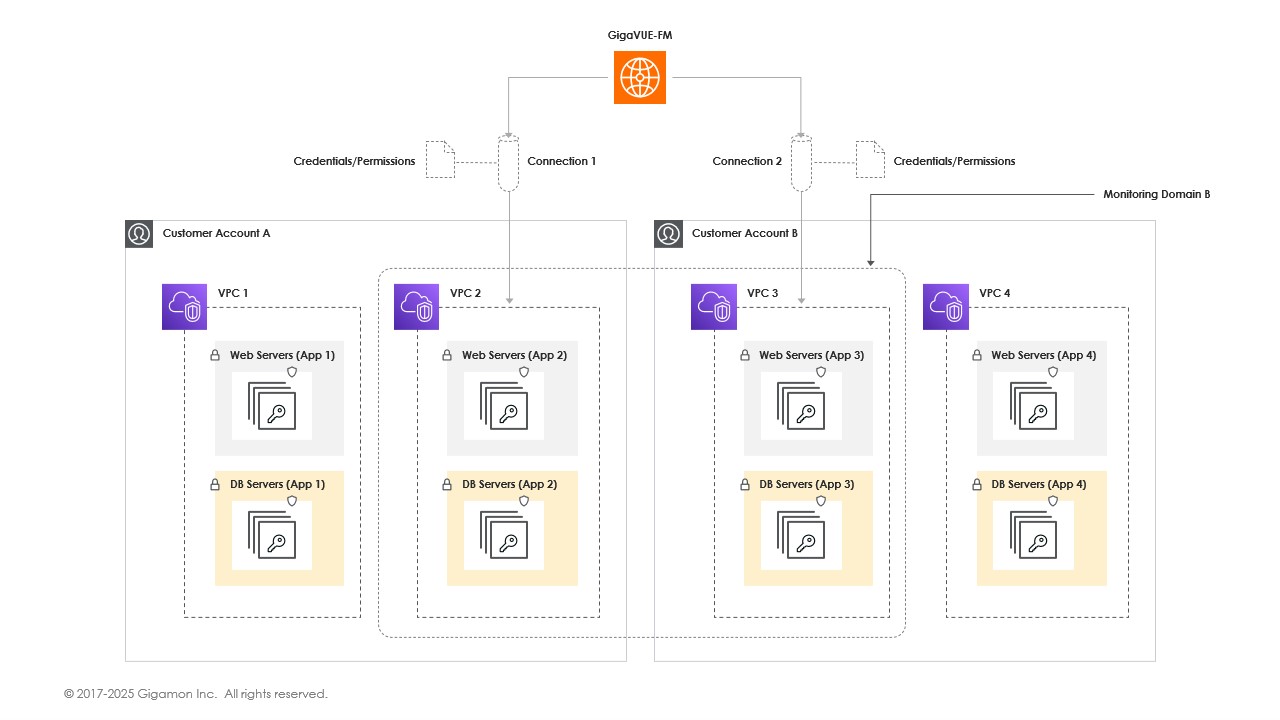 In the above diagram, Monitoring Domain B is created to monitor the resources in VPC 2 and VPC 3, which are from two different accounts. GigaVUE-FM uses Connection 1 to access the resources in VPC 2 and Connection 2 to access the resources in VPC 3. In this case, GigaVUE-FM will not have access to the resources in VPC 1 and VPC 4.