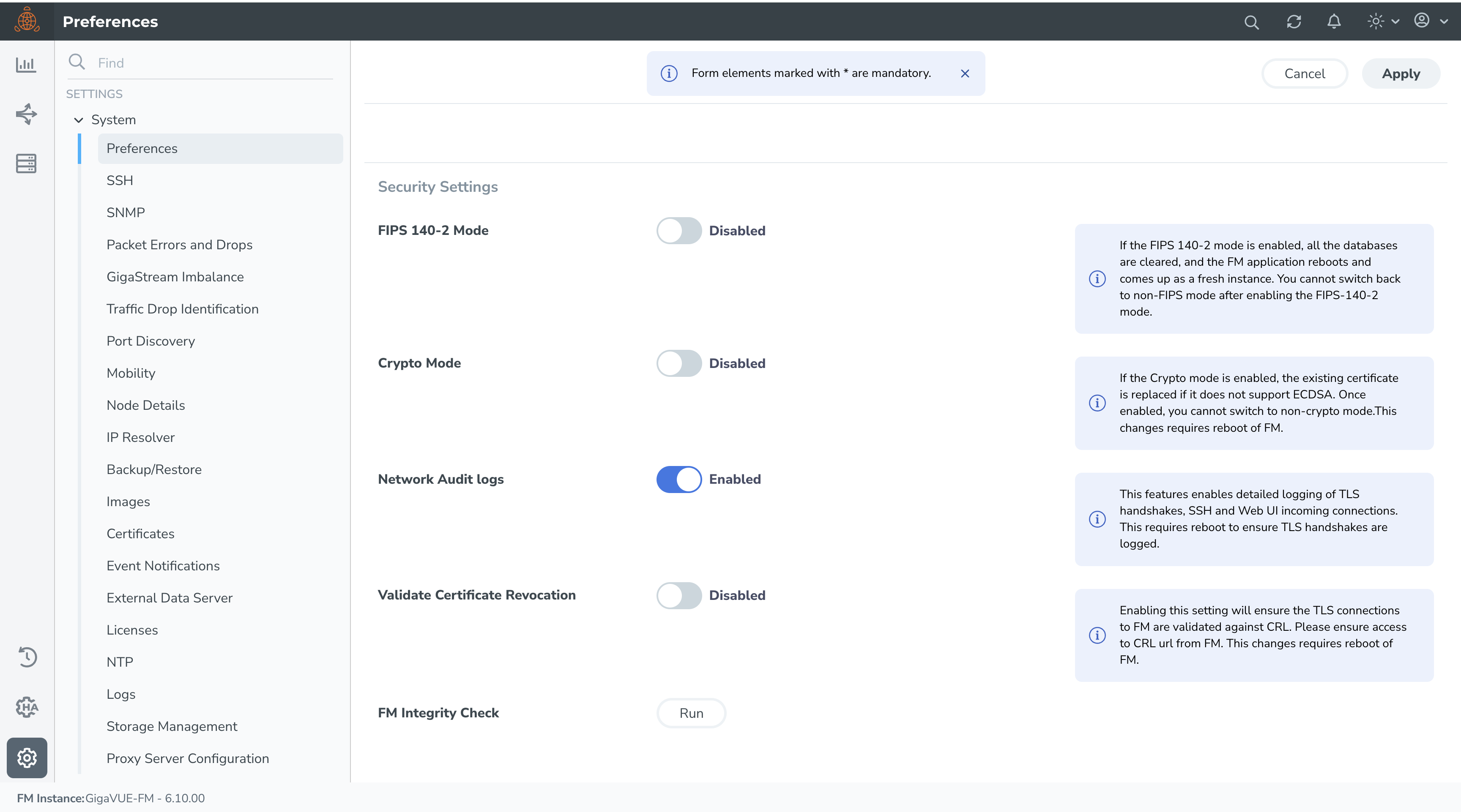 The Network Audit Log feature in GigaVUE-FM records both the incoming and outgoing traffic between network devices. It also provides logs of the interactions with the management system through the web browser such as user requests or configuration changes. This requires rebooting to ensure TLS handshakes are logged. You can use this feature to track and identify incoming and outgoing requests.