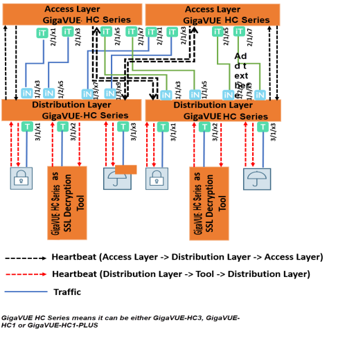 Here, the distribution layer ports facing the tool layer are inline tool ports, while the tool layer ports facing back are inline network ports.