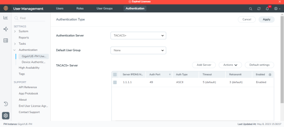Note: If you are deploying GigaVUE‑FM inside AWS, make sure to provide the private IP address of GigaVUE‑FM to the TACACS+ server for authentication and not its public IP address.