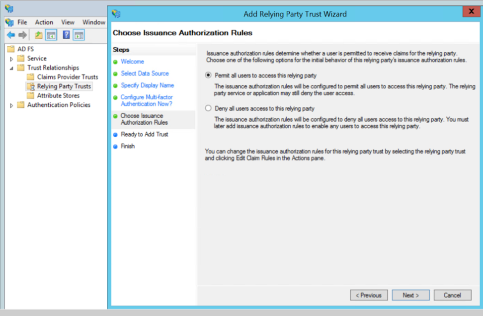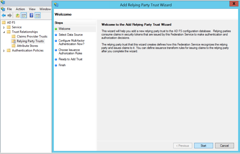 - Select ADFS folder. Go to the Actions menu and select Add Relying Party Trusts.