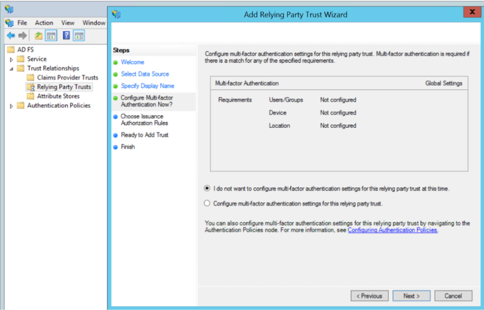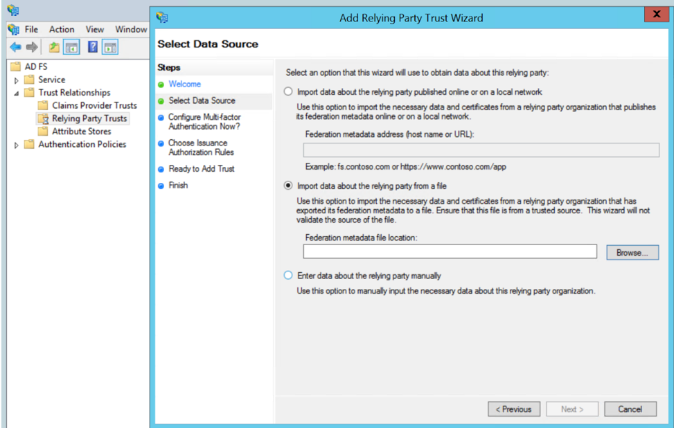 - Select Data Source: Select the Import Data About the Relying Party from a File option. Browse for the SAML metadata file as mentioned in the prerequisites.