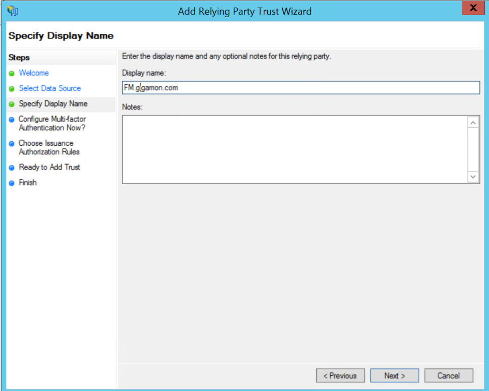 - Specify a Display Name that identifies the application, example, FM.gigamon.com. Click Next.
