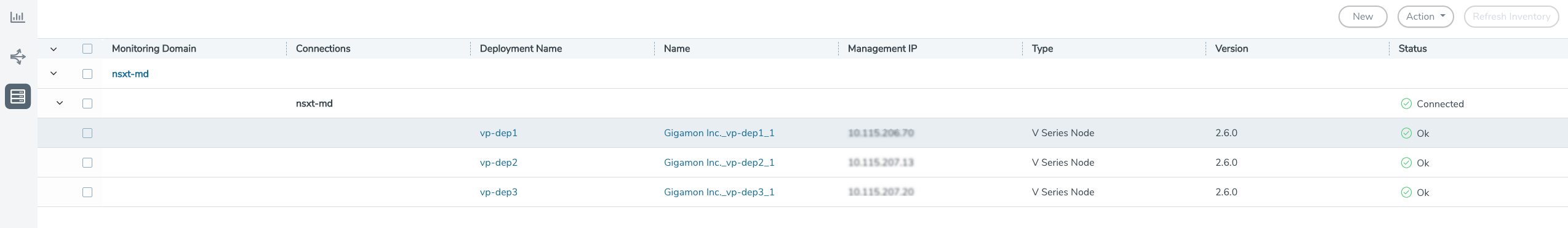 After you create a monitoring domain in GigaVUE‑FM for VMware NSX-T, GigaVUE‑FM establishes a connection with the VMware NSX-T manager and launches the VMware NSX-T Fabric Deployment page.