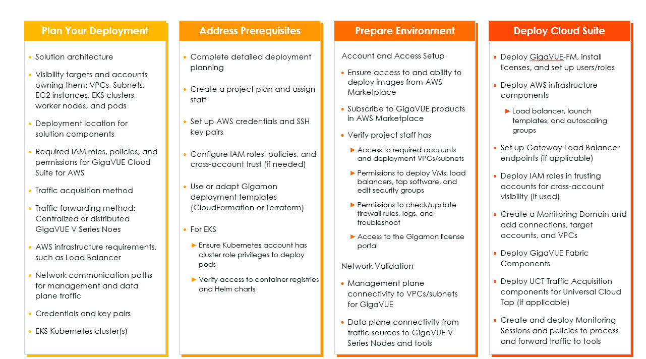 GigaVUE Cloud Suite for AWS deployment follows a set of steps that include planning and preparation before the actual solution deployment. This section provides an overview of the activities associated with GigaVUE Cloud Suite for AWS deployment. The top-level deployment activities are: