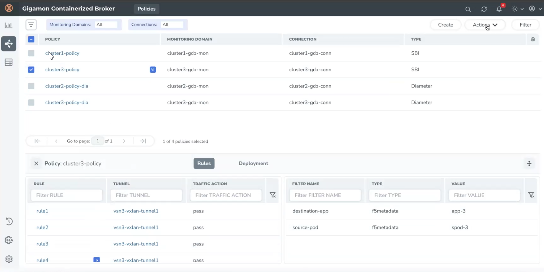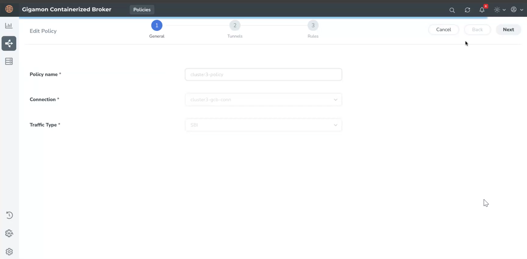 From the left pane of GigaVUE‑FM, select Traffic > CONTAINER > Gigamon Containerized Broker. The Traffic Policy page appears