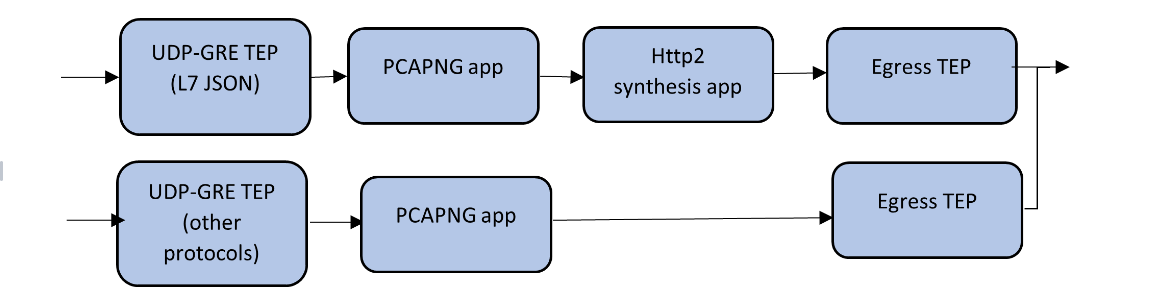 In the SBI application, JSON encoded data traffic is further parsed to extract the source-destination information and is used to synthesize the complete HTTP2 transaction with proper L2, L3, and L4 headers and HTTP2 headers and HTTP2 body of the original HTTP2 transactions. Once the headers are synthesized and a complete HTTP2 transaction is formed, the packets are then given to the egress TEP to send it to the physical/virtual probes.