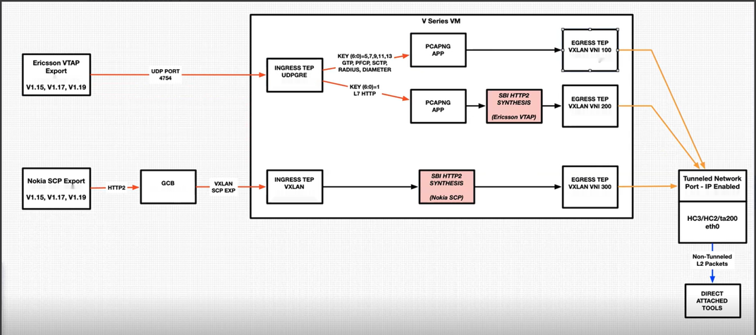 5G-Service Based Interface (SBI) Application synthesizes the HTTP2 transactions with proper L2, L3, and L4 headers from the JSON encoded data that it receives from the UDP-GRE or VXLAN ingress TEPs (Tunnel End Point). Once the headers are synthesized and a complete HTTP2 transaction is formed, the packets are sent to the egress TEP and then sent to the physical or virtual probes.