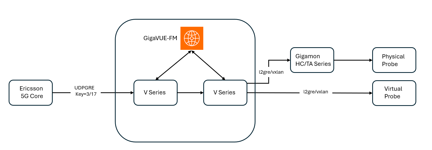 Traffic from the Ericsson 5G Core is encapsulated using UDP-GRE tunnels, with specific keys 3 and 17, to identify different traffic flows from SCP. GigaVUE-FM serves as the centralized management platform orchestrating the visibility fabric, which includes the V Series Nodes. The V Series Nodes inspect, aggregate, and process the incoming packets. After processing, traffic is encapsulated using L2GRE or VXLAN tunneling protocols and forwarded to either physical or virtual probes as follows: