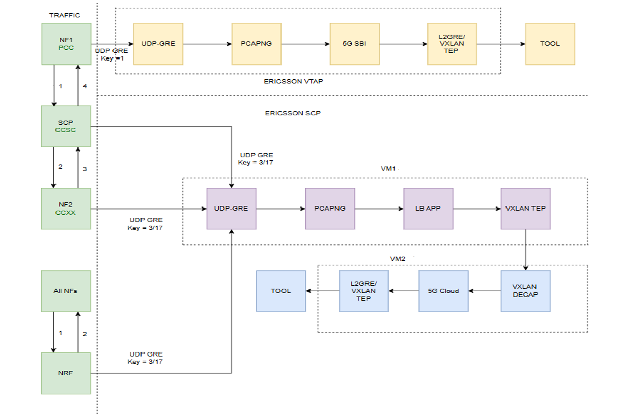 The 5G Core follows a service-based architecture where control plane network functions communicate using the HTTP2 protocol. In Ericsson SCP Mode, HTTP2 transactions are mirrored through the Service Communication Proxy (SCP) and encapsulated using UDP-GRE for further processing.