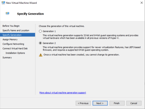 - On the Specify Generation page of the New Virtual Machine Wizard, select Generation 2.