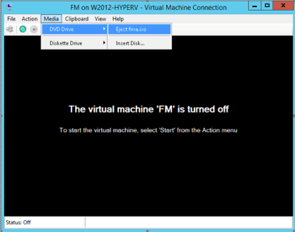 The next step is to connect to the GigaVUE‑FM virtual machine from within Hyper-V Manager and start it. This begins the actual installation of the GigaVUE‑FM Virtual Appliance from the connected ISO image file. Once GigaVUE‑FM finishes installing from the ISO image file, you will then disconnect the ISO image file and restart the virtual machine.