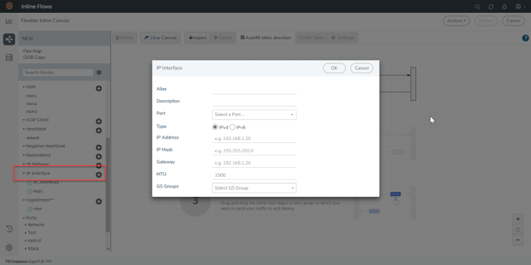 |  | 2. | In the Flexible Inline Canvas that is displayed, select the required device for which you want to configure the IP Interface. |