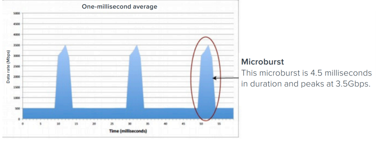For example, two 100Gb ingress ports transmit traffic to a 10Gb egress port at an average rate of 1Gbps each. The aggregate bandwidth utilized will be 2Gbps (1Gbps x 2 network ports), which is well within the bandwidth of the 10Gb egress port. However, if there is a sudden spike in traffic from one of the ingress ports, that is, traffic is transmitted at a rate of 3.5Gbps in 4.5 milliseconds (as shown in the figure below), it is referred to as a microburst.