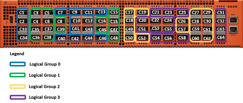The ports in GigaVUE‑HC3, GigaVUE-TA100, and GigaVUE-TA200 are grouped in to four logical groups—Group 0, Group 1, Group 2, and Group 3. You must ensure that the ingress and egress ports are spread across these logical groups to improve burst tolerance.