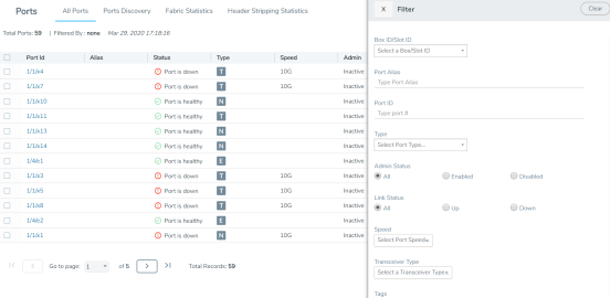 The ports that display on the Ports page can be filtered so that only ports that meet certain criteria display on the page, such as port type and admin status. To filter the ports, select Filter. This opens the Filter view shown in 4 where you can specify how to filter ports displayed on the Ports page.
