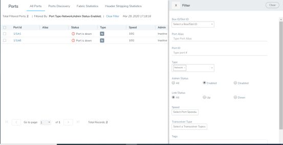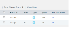 After the filter is applied, the Ports page displays only the ports that correspond to the selected filters and shows the total number of ports that meet the criteria. To clear the filters, select Clear Filter. 6 shows the Port pages with two ports that correspond to the current filters: Network Type and Admin Status Enabled.