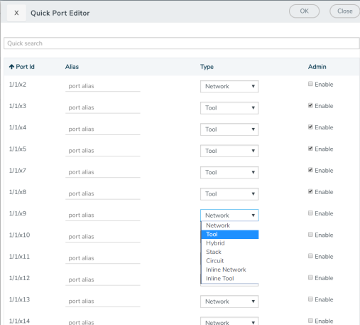 | Type | List the type of port such as network, tool, stack, inline network, inline tool, circuit, or hybrid. You can set the port type through the Quick Port Editor or selecting the port on the Port page and clicking Edit. The port type is set by selecting the type in the Type field. | ||||||||||||