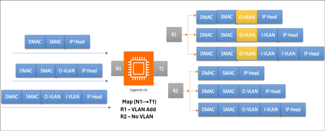 |  | ■ | Map-Based- In this method, VLAN manipulation is configured for traffic that qualifies under rules defined in regular by-rule maps and shared collectors.  This configuration applies to all rules within the map except for drop rules. Map-based VLAN manipulation adds a new VLAN tag to the incoming traffic that matches the rule and can be applied to a deployed map. For more information, refer to the Map VLAN manipulation Source and Destination Compatibility Matrix . The figure below illustrates how the Outer VLAN (O-VLAN) can be added to the rules of the incoming traffic using the VLAN Add operation within the map-based configuration. |
