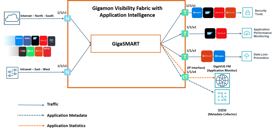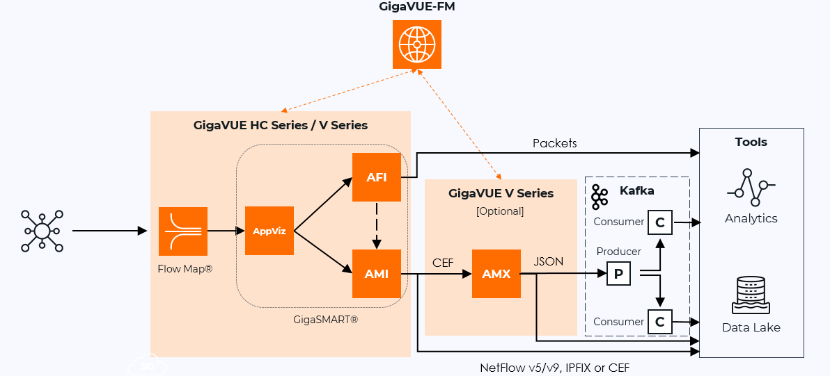This simplified deployment model illustrates the end-to-end traffic flow. The solution can be deployed via GigaVUE-FM or GigaVUE Cloud Suite for Third Party Orchestration and will be monitored through GigaVUE-FM.