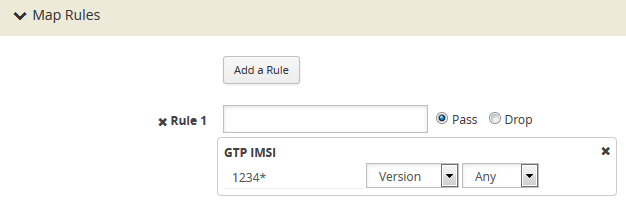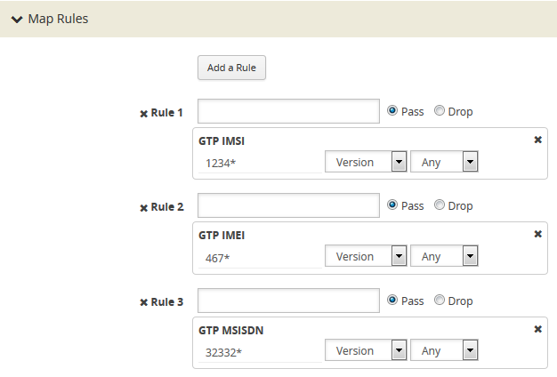 For example, in a GTP session, if an IMSI matches the first rule in map1 and an IMEI matches the second rule in map1, because the drop rule has higher priority, the packet will be dropped:
