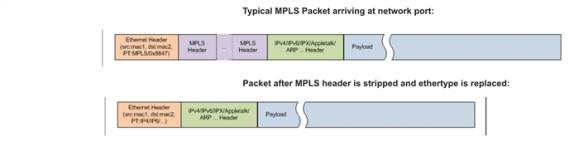 The following figures illustrate how the header-stripping operations work – you can see the original MPLS packet with its label stack intact, followed by a stripped packet with a recalculated CRC and a new ethertype field.