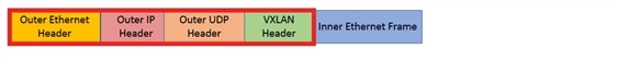 VXLAN encapsulates Ethernet packets in IP using VXLAN header. In this example, the outer Ethernet header, outer IP header, outer UDP header, and VXLAN Header are stripped from the VXLAN encapsulated packets.