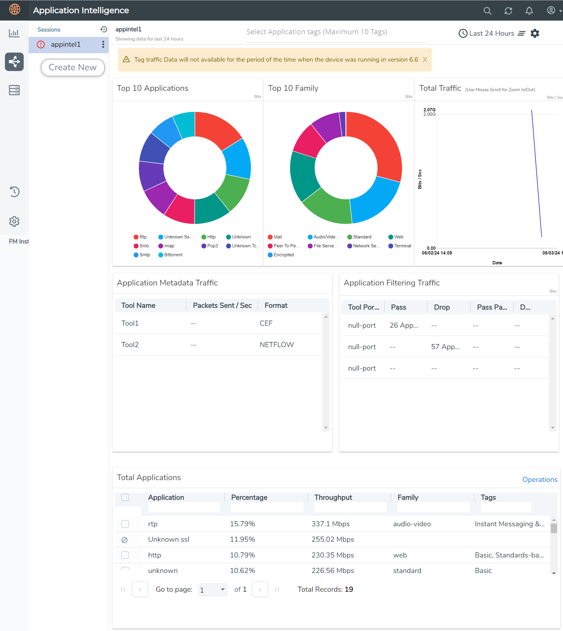 Note:  You can filter the applications listed under Total Applications using the parameters such as Application, Percentage, Throughput, Family, and Tags.