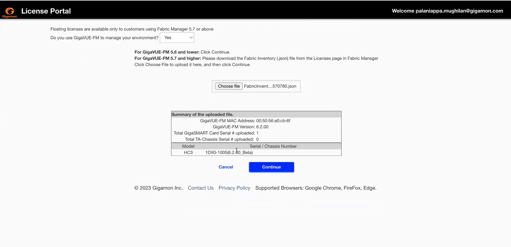 - Choose the Fabric Inventory File downloaded from GigaVUE-FM and click Continue.