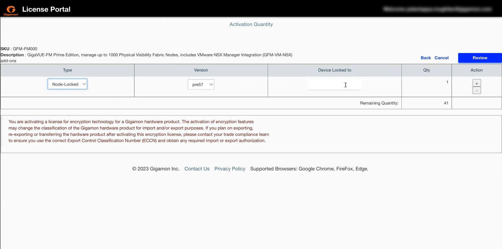 - Specify the required quantity of the licenses. Click the +/- options under Action column. Click Review.