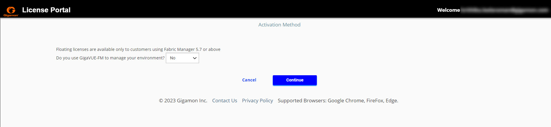 - In the "Do you use GigaVUE-FM to manage your environment" option, select No and click Continue. The Activation Quantity page appears.