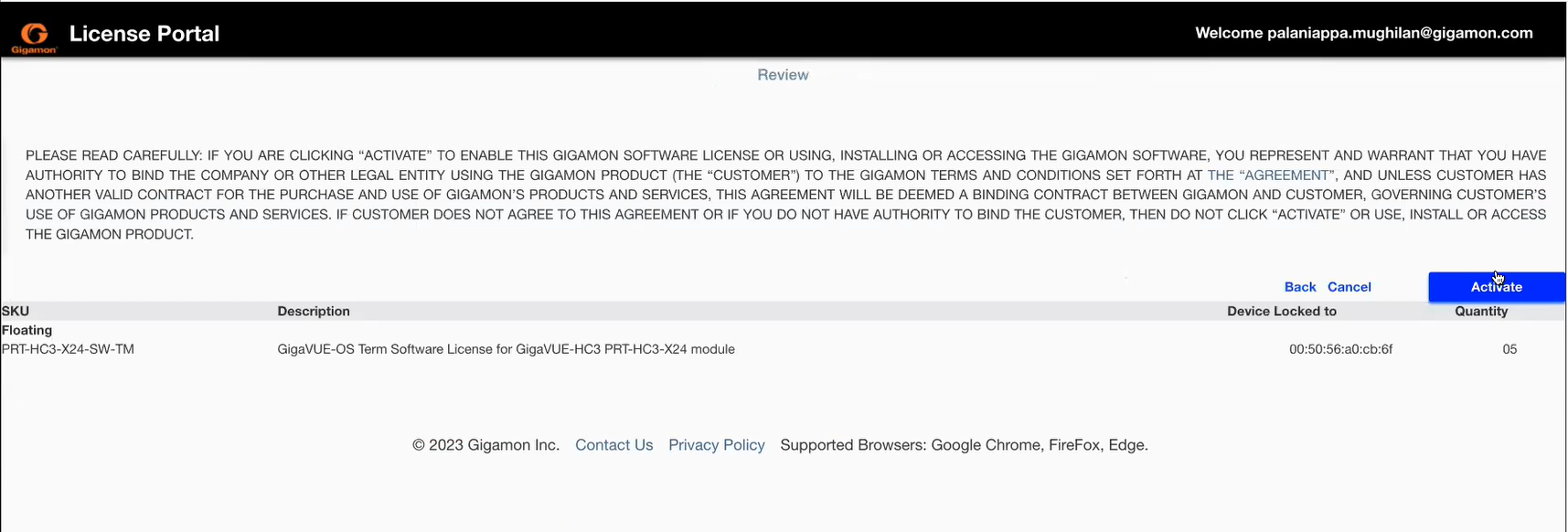 - After reviewing the license details, click Activate to activate the license.