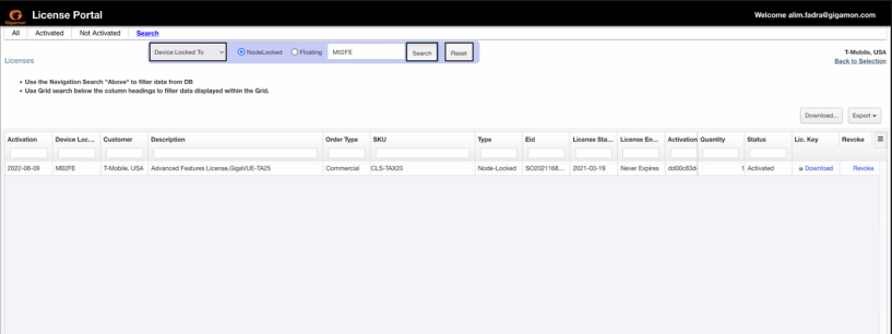 Use the filter options in the Gigamon license portal to find the required license. The following search options are available.
