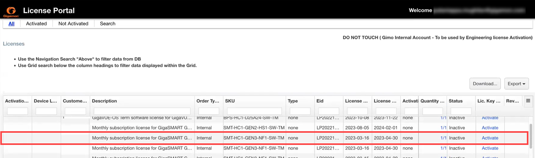 | Status | Status of licenses, whether activated or not-activated |