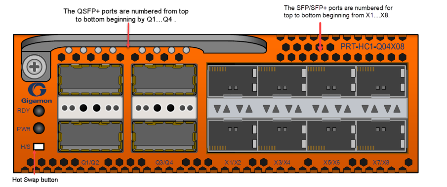 The PRT-HC1-Q04X08 line card consists of four (4) 40Gb QSFP+ ports and eight (8) 1GB/10Gb SFP/SFP+ ports.