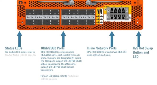 The maximum number of BPS-HC3-Q35C2G and BPS-HC3-C35C2G modules per chassis is four. Each module can support up to two 40Gb or 100Gb inline network port pairs, respectively, and sixteen 10Gb ports per module for a total of sixty-four. |