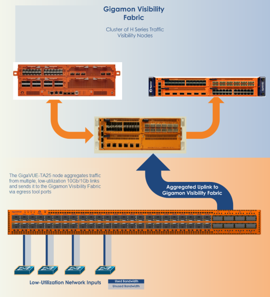 GigaVUE TA Series nodes combine traffic from multiple low-use links before sending it to GigaVUE HC Series nodes in your Gigamon Deep Observability Pipeline.