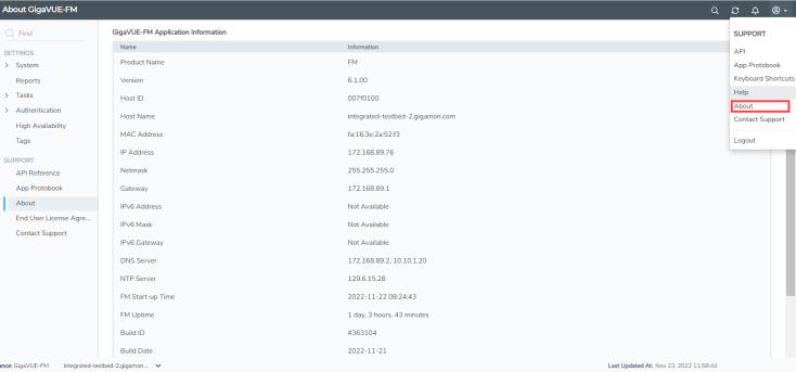 The About page provides product and version information of GigaVUE-FM that you can use when contacting customer support.