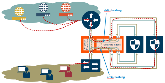 Use asymmetrical hashing if all traffic exchanged between a particular node on one side of the network and any nodes on the other side of the network that communicate with that node need to go to the same inline tool. The asymmetrical hashing options involve only source IP address (srcip) in one direction and only destination IP address (dstip) in the opposite direction. Bi-directional traffic, such as between a given user and all the Internet sites visited by the user, will be sent to the same inline tool in the group.