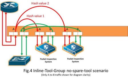 Refer to 2 for an inline tool group with a single inline tool and a spare inline tool configured. This is also referred to as 1+1 redundancy or N+1 redundancy where N equals 1. In 2, traffic is only shown from A-to-B.
