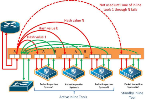 The inline tools in the inline tool list are considered to be active inline tools. The traffic is hash-distributed over the active inline tools as long as all the inline tools are healthy, When one of the active inline tools fails, the spare inline tool takes the place of the failed inline tool and the new set operates as a new active set. If another inline tool fails, the traffic is redistributed according to the failover mode, as if there was no spare.