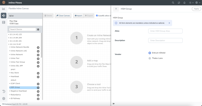 In the displayed Flexible Inline Canvas, select the device where you want to configure the HSM Group. |