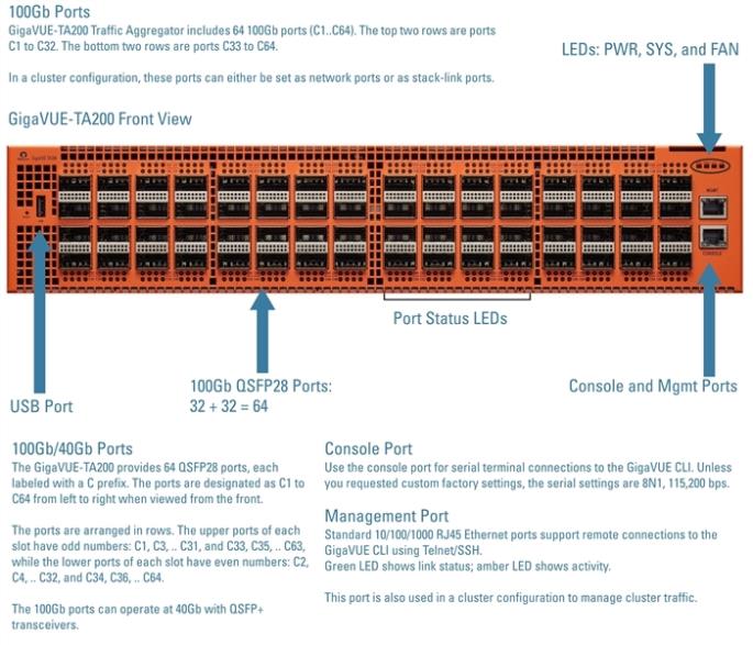 The GigaVUE‑TA200 provides sixty-four ports, supporting high-density aggregation. Depending on the transceiver, QSFP+ or QSFP28, the ports run at speeds of either 40Gb or 100Gb. With QSFP28 SR4 transceivers, a 100Gb port can be broken out into four 25Gb ports, called 4x25G mode. With 40G SR4, 40Gb ESR4 and PLR4 QSFP+ transceivers (QSF-502, QSF-507, and QSF-506, respectively), a 40Gb port can be broken out into four 10Gb ports, called 4x10G mode.