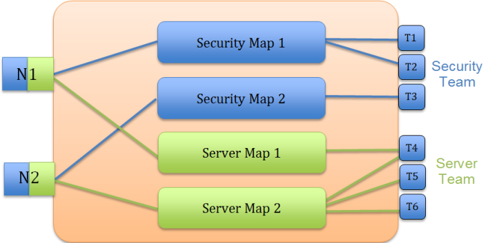 1shows an example of role-based access control in action. Different teams have been assigned roles that give them access to different sets of ports. For example, the Security Team has access to network ports N1…N2 and tool ports T1…T3. Because the Security Team is sharing N1…N2 with the Server Team, permissions are used to give each team full control of their tool ports while preventing port parameter changes to the shared network ports.