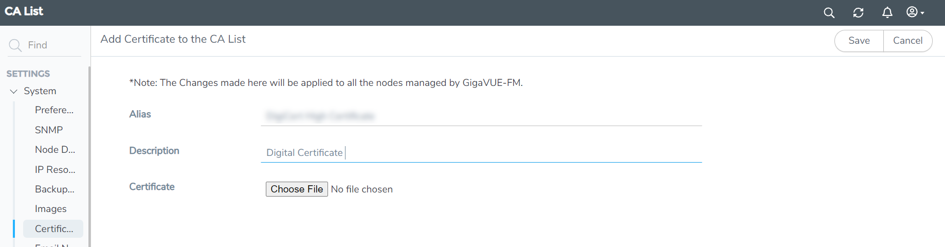 The CA List page allows you to add the root CA certificate for the devices. You can access the CA List page from GigaVUE-FM as well the devices: