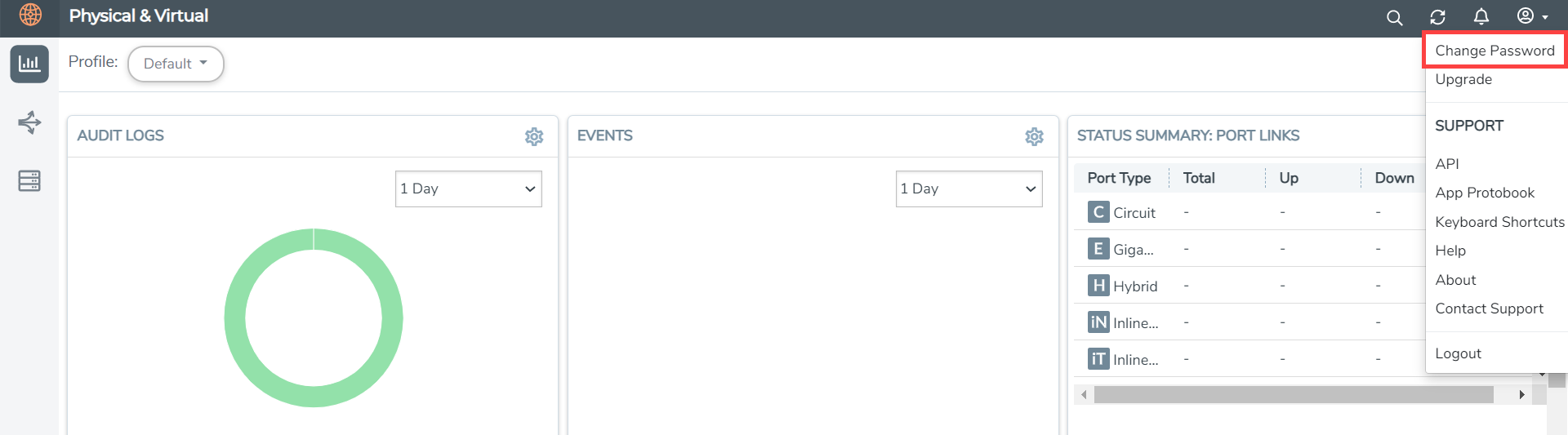 Click on the button in the upper right-hand corner of GigaVUE‑FM, where your user name is displayed, and select Change Password. |